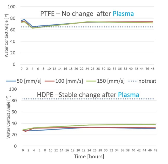 Figure 1 displays how different polymers (PTFE and HDPE) receiving the same treatment reacted differently to the plasma treatment and remained active and ready for adhesion for different lengths of time. In these trials, water contact angle measurements were used to gauge the quality of the surface over time. Each colored line represents various distances where plasma treatment was administered. The dotted line represents the polymer before treatment. You can see how, over time and depending on the material, the effect of the treatment can wear off and lead to adhesion failure.